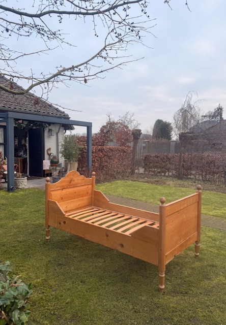PICK UP ITEM. SALE. SFEERVOL DOORLEEFD OUD-GRENEN KAJUITBED.