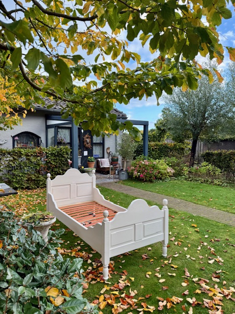 SFEERVOL WIT MASSIEF GRENEN KAJUITBED. 90x200cm.
